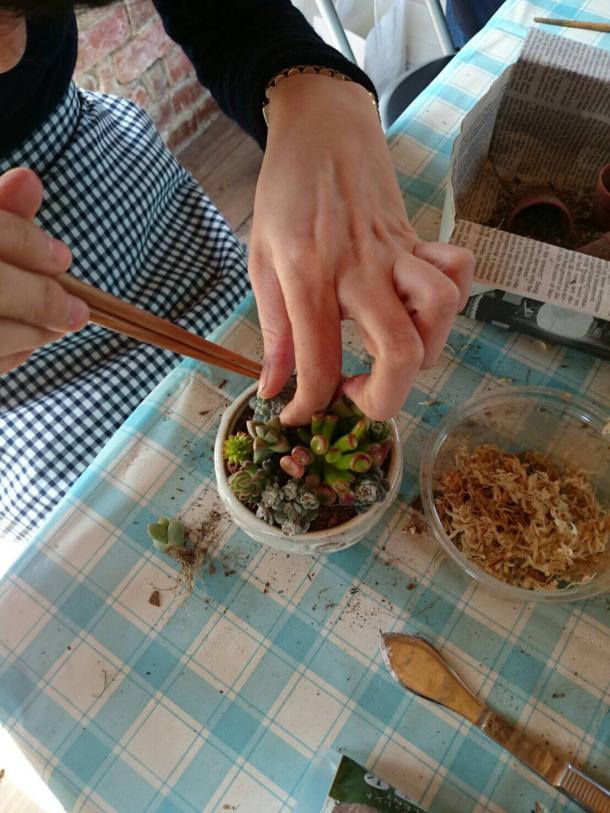 そして、選んだ容器に、お好きな多肉ちゃんを選んでもらって植え込んでいきます。