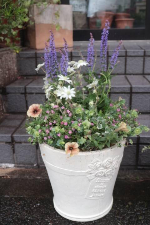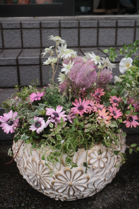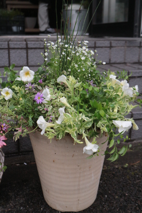 ころんと丸い鉢に、ペチュニアホイップマカロンがかわいい♡